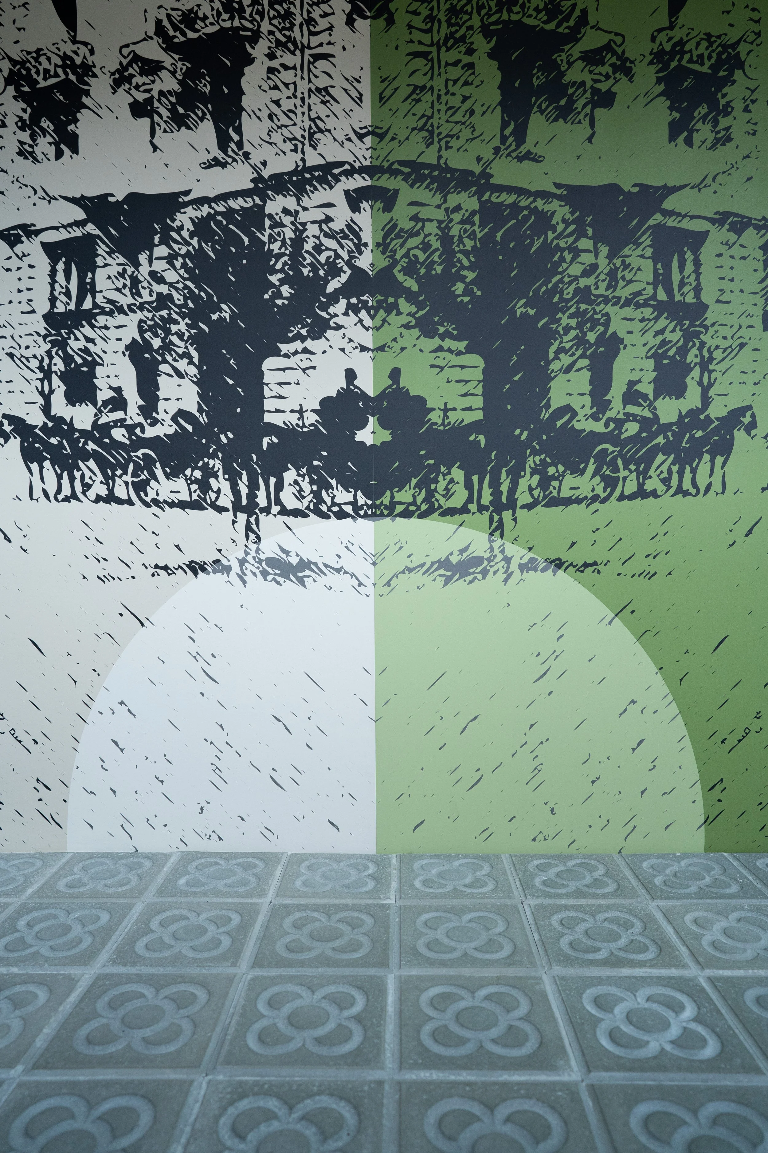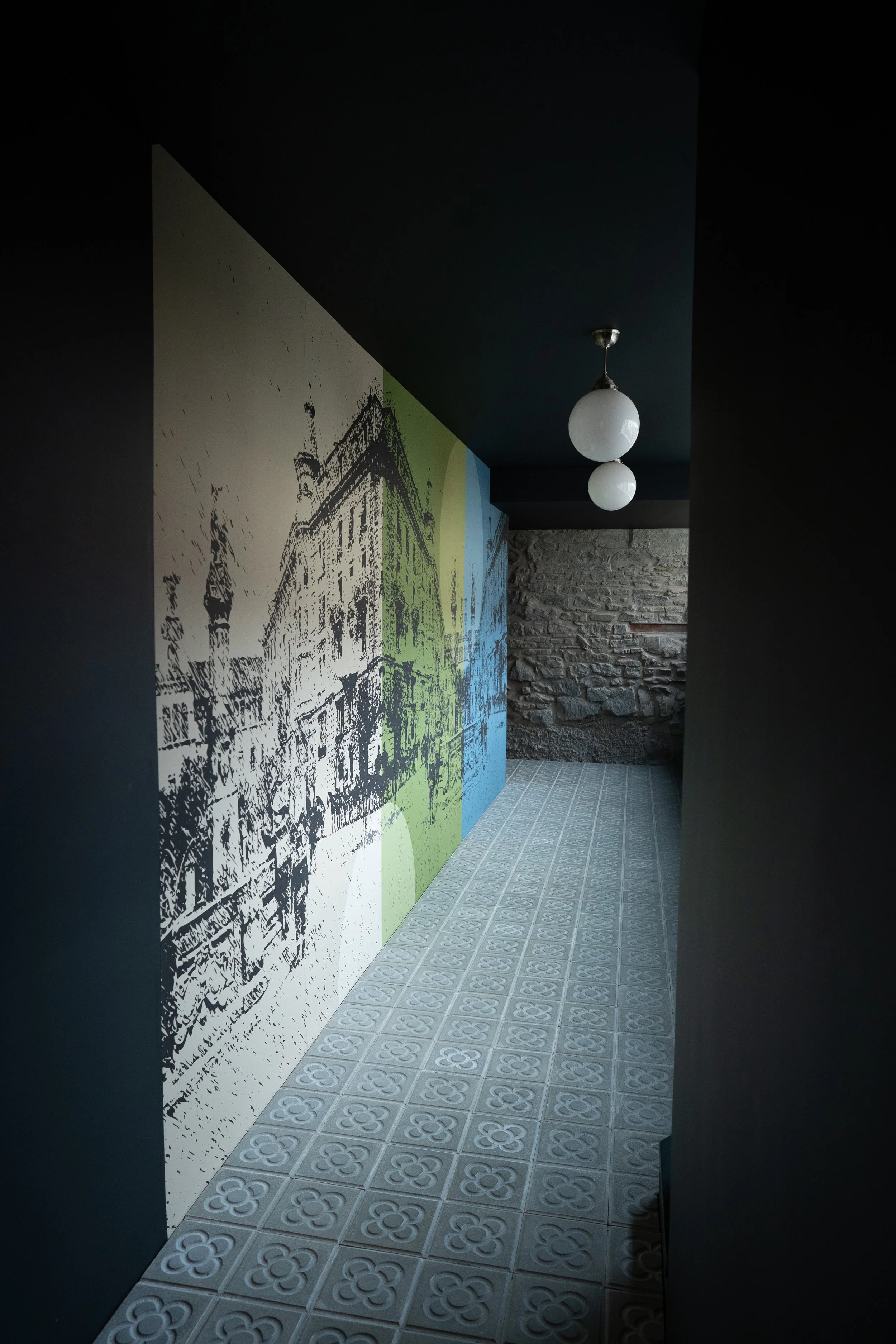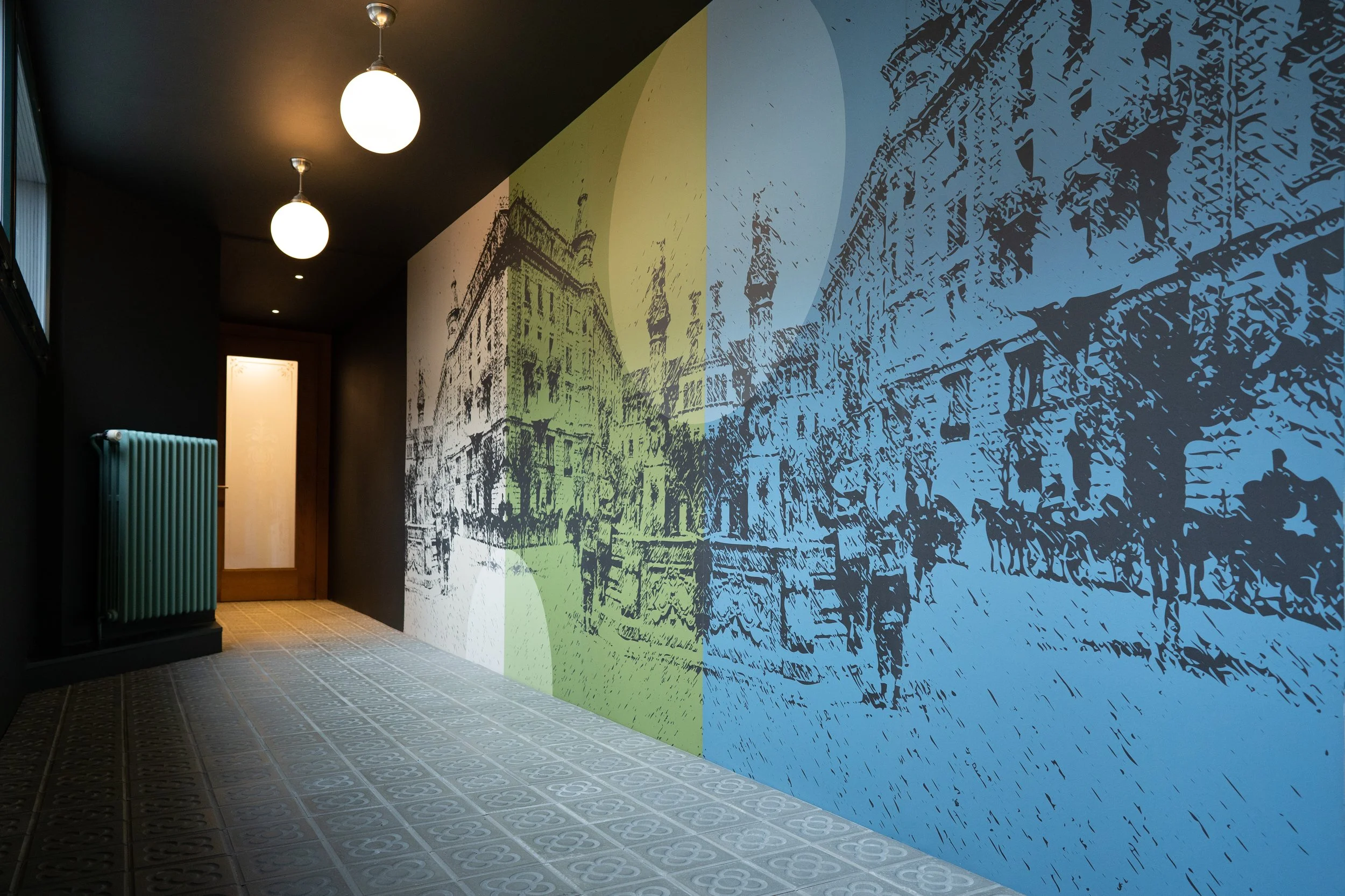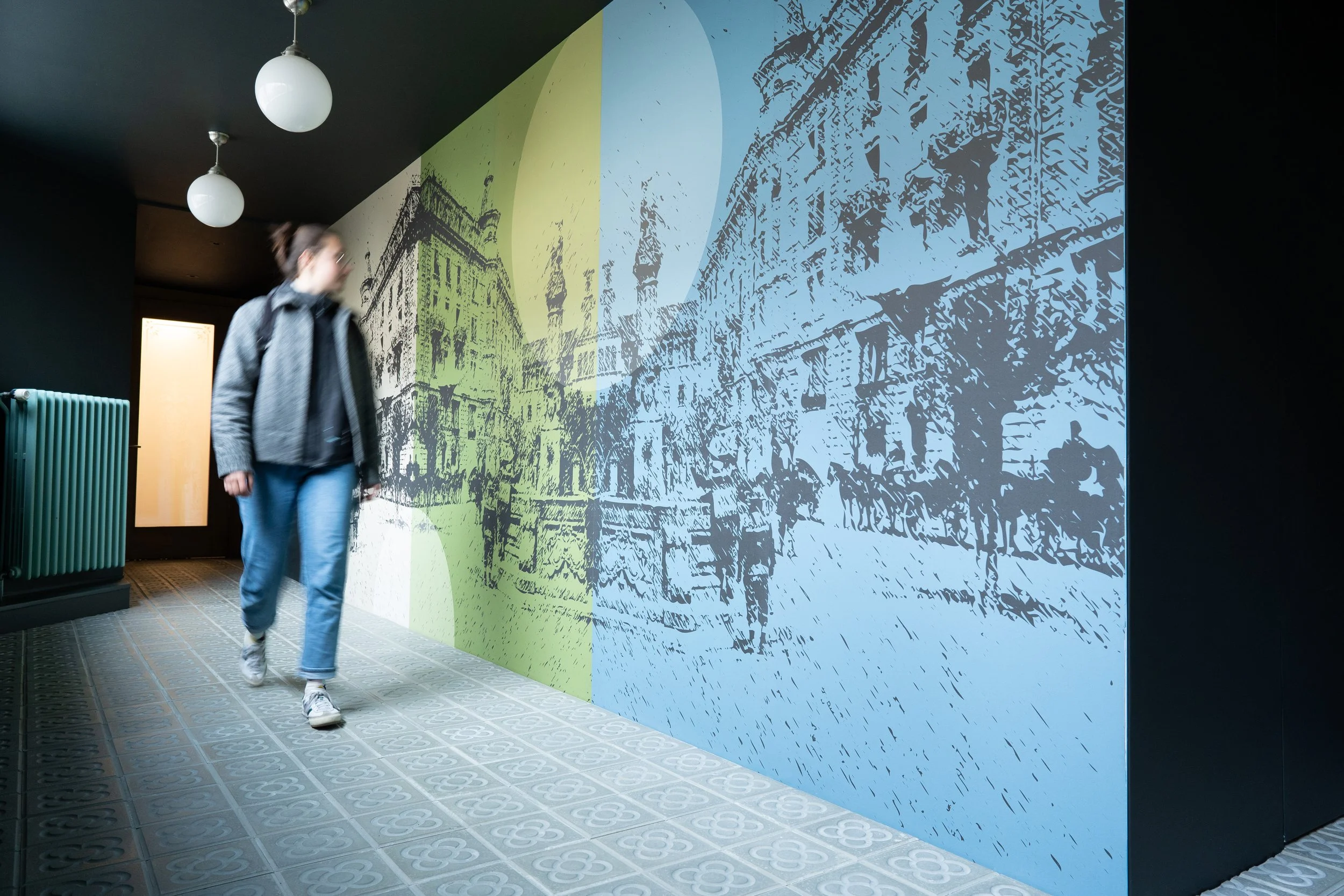 Die Auftraggeberin wünschte sich für den Durchgang dieses Wohn- und Gewerbehauses am Hirschengraben eine Aufwertung. Dazu entschied sie sich gemeinsam mit dem Grafiker Rolf Rüegg für eine historische Fotografie des Hirschenplatzes, welche Rolf gestalterisch neu interpretierte. Gedruckt wurde das Motiv von Simon Gygax, der die Tapete zur Applikation an Frieda Gysin übergab.